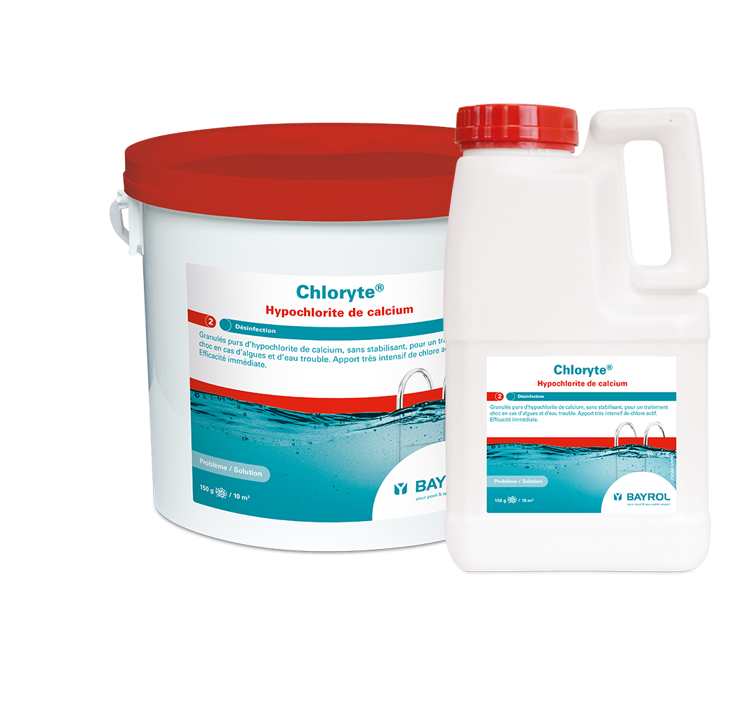 • Chloration choc en cas de problème (algues ou eau trouble) : ajoutez directement dans l’eau 150g de Chloryte pour 10 m³.