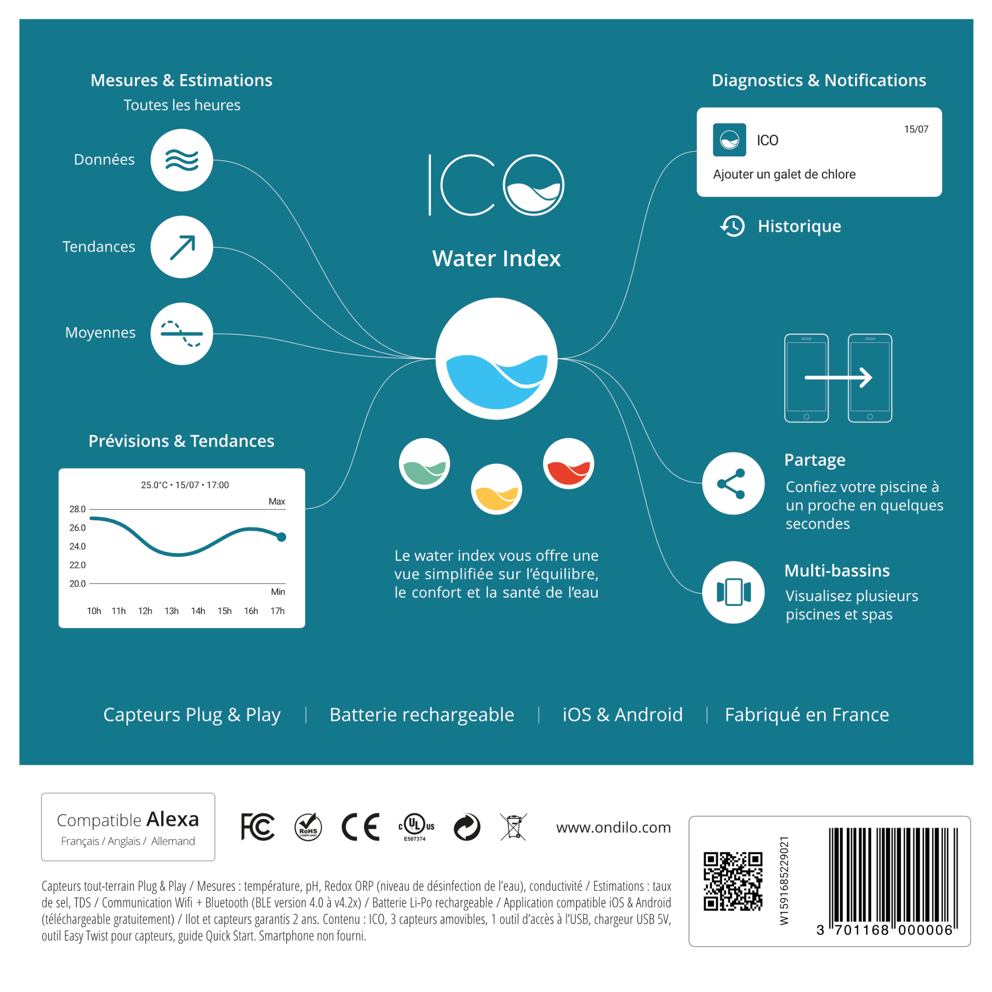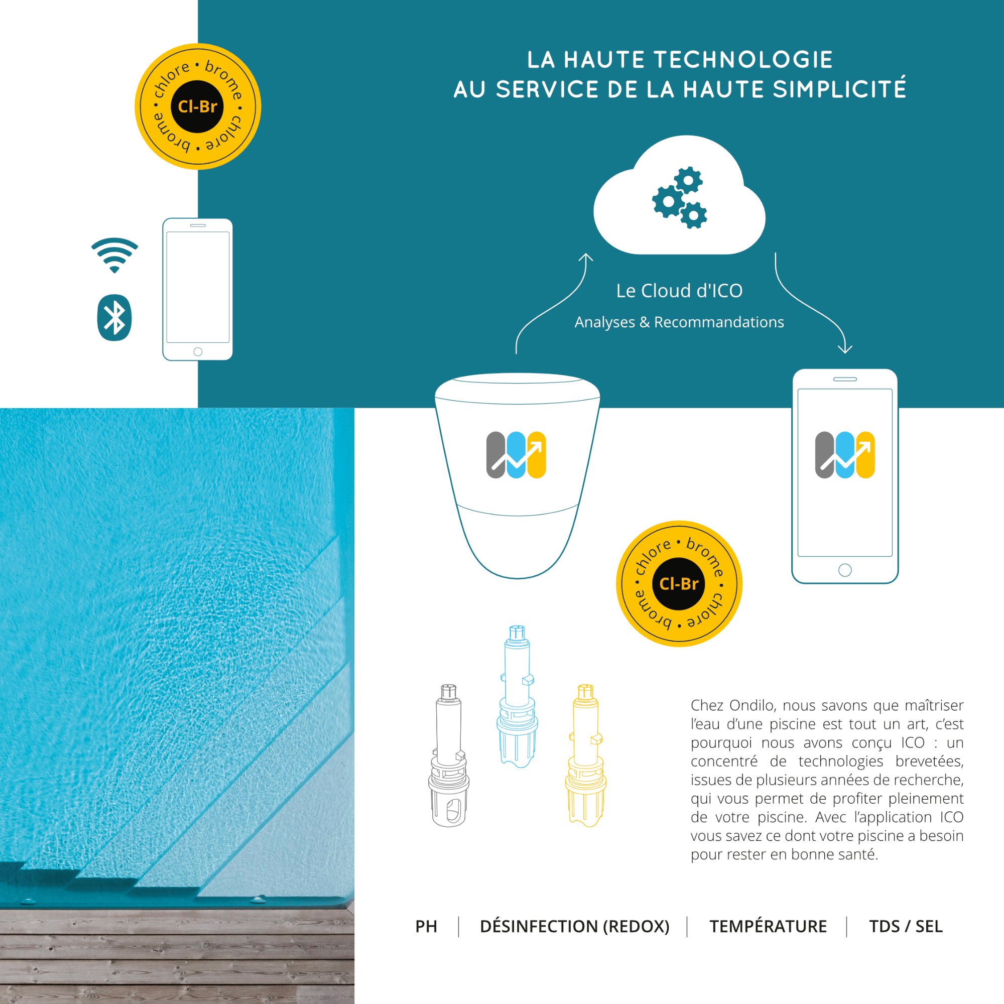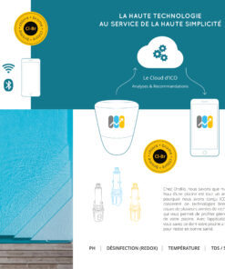Température, pH, oxydo-réduction, conductivité, taux d’algues et de tartre, présence invisible de bactéries… : ICO m’indique à tout moment si mon eau est vraiment bonne pour la baignade ou si elle requiert un traitement.